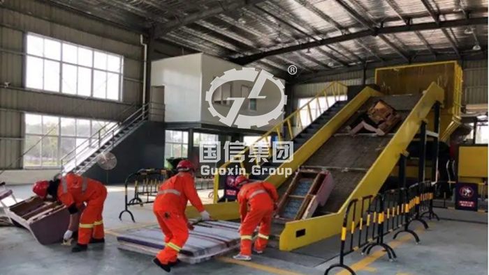Guoxin Machinery design of large garbage crushing capacity reduction program, the use of shredding + iron separator+ baler process, designed to quickly achieve the capacity reduction of large garbage and initial resource treatment, reduce storage and transportation costs.