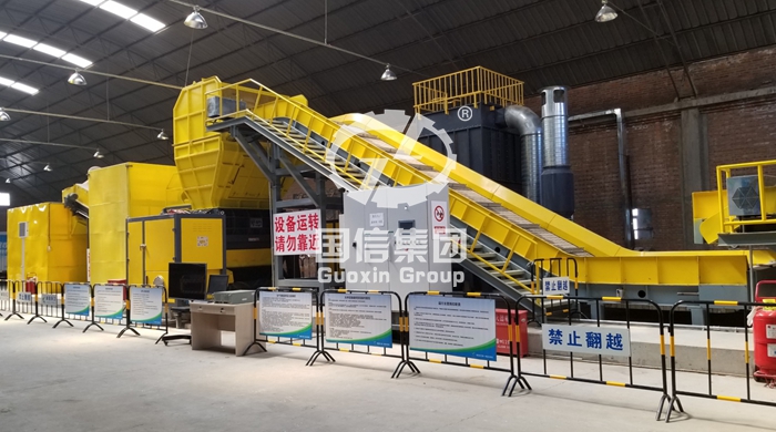 The industrial solid garbage shredding production line designed by Guoxin machinery goes through the rough shredding + iron separator++ fine crusher +baling (or RDF Briquette Machine), the material is sent to the industrial solid waste special shredder through the chain plate conveyor for coarse crushing, after the coarse crushing through the secondary shredder for fine crushing again, and the material after the fine crushing is sorted by the magnetic separator (select iron products). The shredded materials are transported by the discharge conveyor to the RDF forming machine to make fuel rods directly sold to the thermal power plant as fuel, or directly transported to the hydraulic baler to compress and pack, and then sold abroad, which not only disposed of garbage, but also earned profits.