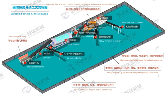 Guoxin provides stable and reliable solutions for the disposal of Landfill Waste Sorting machine, with its own research and development, manufacturing, sales, installation, and after-sales teams that can meet the needs of different industries. Suitable for intelligent processing of Landfill Waste Sorting equipment, Landfill waste screening equipment, Landfill Waste Sorting production line, etc. We provide one-stop engineering services for customers at home and abroad, including technical consultation, scheme design, project planning, equipment research and development and manufacturing, on-site installation and construction, technical training, and on-site maintenance.