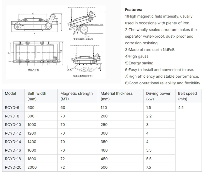Guote RCYD Self-cleaning Permanent Magnetic Separators for belt conveyor is made up with permanent magnetic chip , iron-discharging belt, reducer, frame and roller etc. and can match with all kinds of conveyors.
