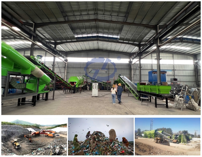 Chain feeder –Bag breaker–Belt conveyor –Waste trommel screen machine — Iron separator –Air separator– Manual sorting platform — Garbage packaging system.